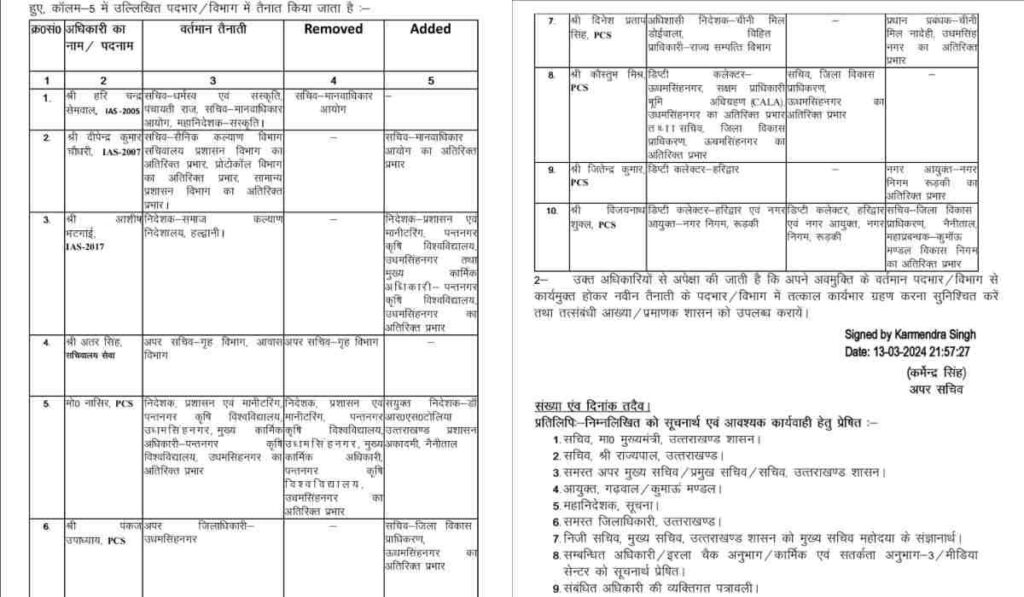 उत्तराखंड से बड़ी खबर सामने आ रही है। धामी सरकार ने बुधवार देर रात कई आईएएस और पीसीएस अधिकारियों के तबादले किए हैं। इनमे से कई अधिकारियों को अतिरिक्त कार्यभार दिया गया है। देर रात शासन ने ट्रांसफर की लिस्ट जारी कर दी है।