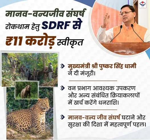राज्य में बढ़ते मानव-वन्यजीव संघर्ष की घटनाओं पर प्रभावी रोक लगाने के उद्देश्य से राज्य आपदा प्रतिवादन कोष (SDRF) से ₹11 करोड़ की धनराशि स्वीकृत की गई है। इस राशि का उपयोग वन क्षेत्रों से सटे ग्रामीण एवं संवेदनशील इलाकों में मानव-वन्यजीव संघर्ष को कम करने हेतु विभिन्न रोकथाम एवं सुरक्षा उपायों को लागू करने में किया जाएगा।