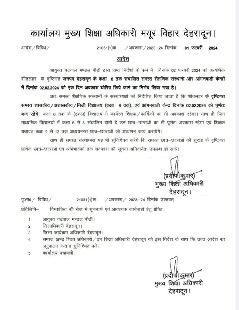 मौसम वैज्ञानिकों ने भी दो फरवरी को पहाड़ी इलाकों में बर्फबारी और मैदानी इलाकों में बारिश का एलर्ट जारी किया है. Jise देखते हुए शिक्षा विभाग ने दो फरवरी के लिए अत्यधिक ठंड को देखते हुए जनपद देहरादून के सभी विद्यालयों में कक्षा 1 से 8 तक एक दिवसीय अवकाश घोषित किया है. गुरुवार देर रात ही शिक्षा विभाग ने अवकाश का आदेश जारी किया है.